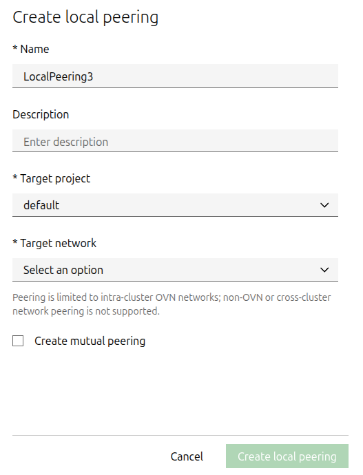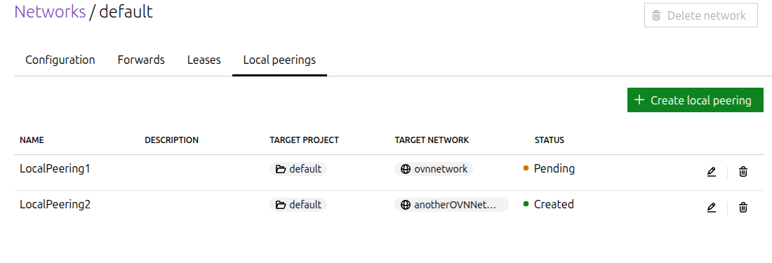 lxc network peer create <network1> <peering_name> <project2/network2> [configuration_options] --project=<project1>