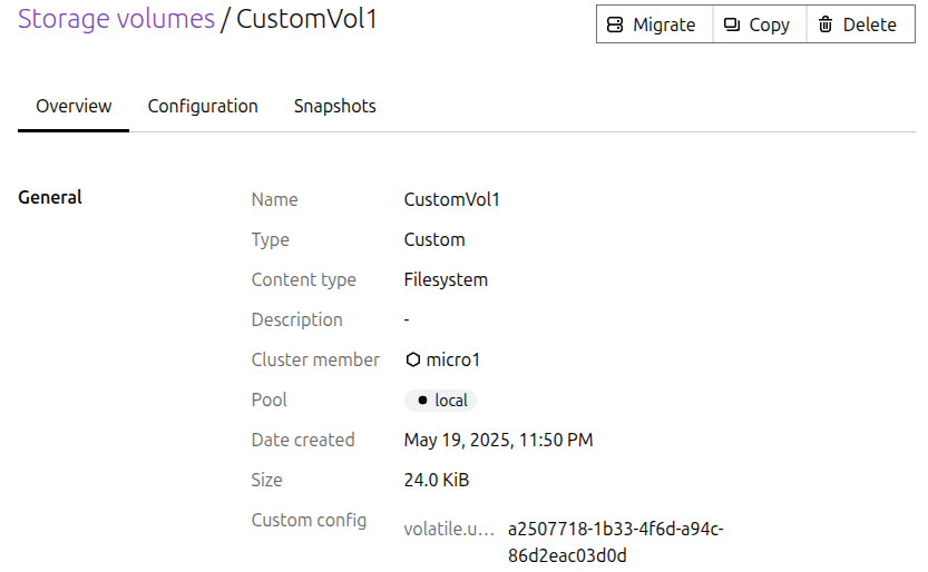 To copy or migrate a custom storage volume from one cluster member to another, add the --target and --destination-target flags to specify the source cluster member and the target cluster member, respectively.