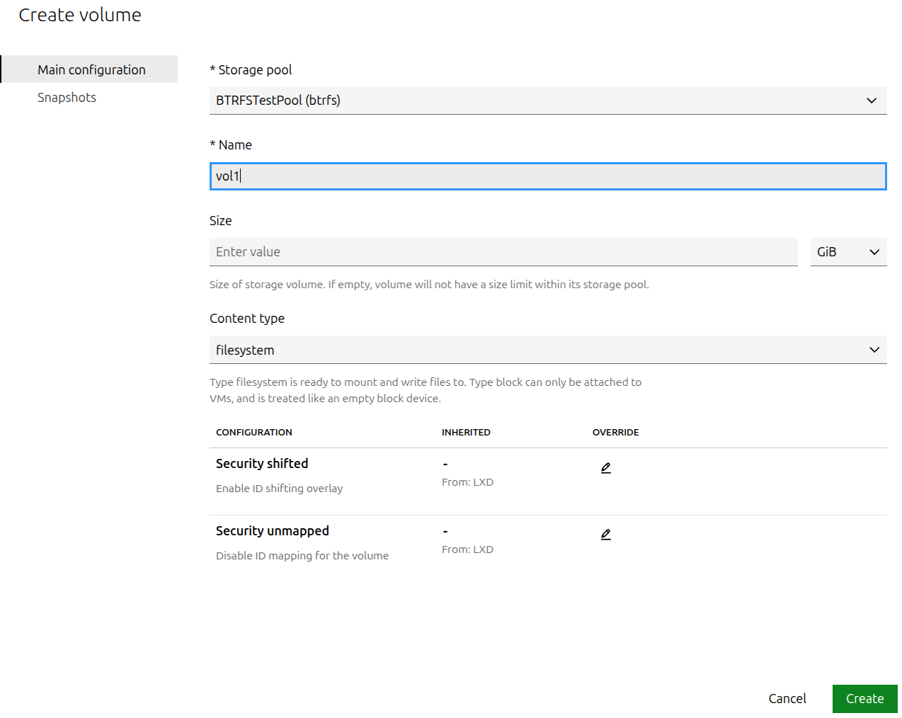 For storage volumes of type container or virtual-machine, the pool’s volume configuration can be overridden via the instance configuration.